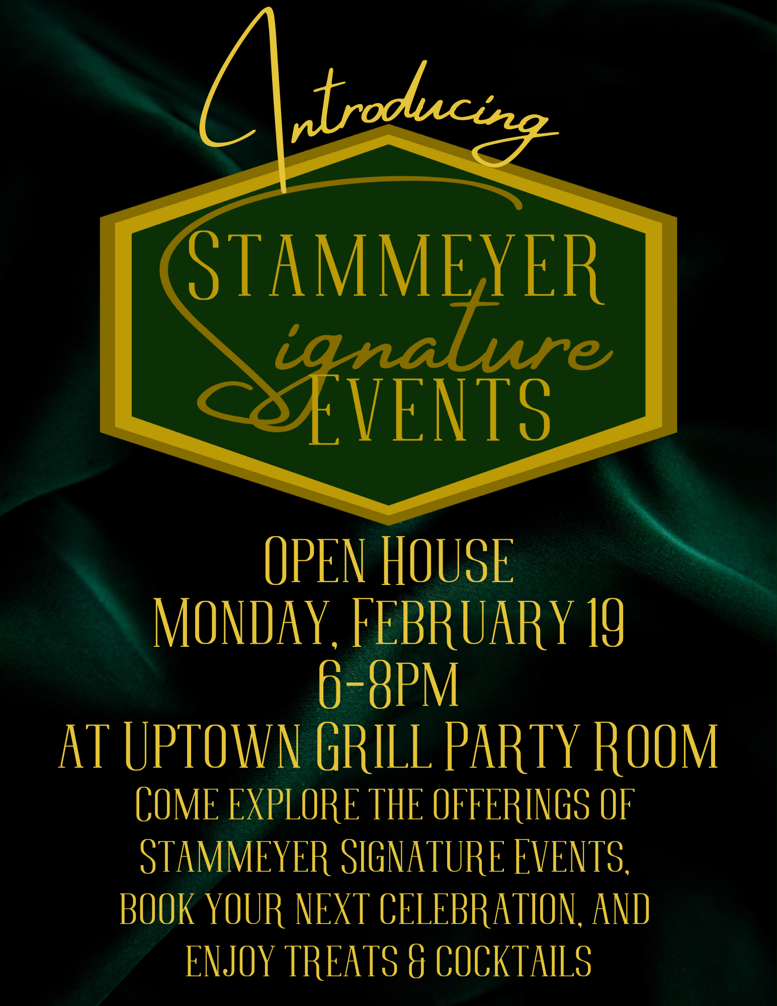 Hello! We are so happy you are here. Stammeyer Signature Events will be having an Open House – “Open for Business” party and we want you to attend. Plan to come with friends, kids or family. Stop by for a beverage and snack and see a small sampling of all that Stammeyer Signature Events can do you for. If you have a wedding, shower, birthday, retirement or graduation in the next 12 months you are going to want to stop by! There may just be special discounts and prizes available. (Ok, there WILL be special discounts and prizes!)