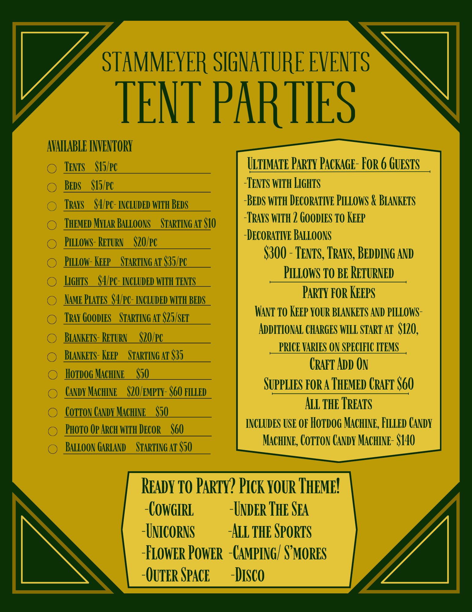 Give your kiddo a party they will never forget with a SSE Tent Party! For up to six children, full set up and clean up by SSE staff. Add a craft package for a fun activity. Menus available upon request as well! Everything you need, one quick stop.